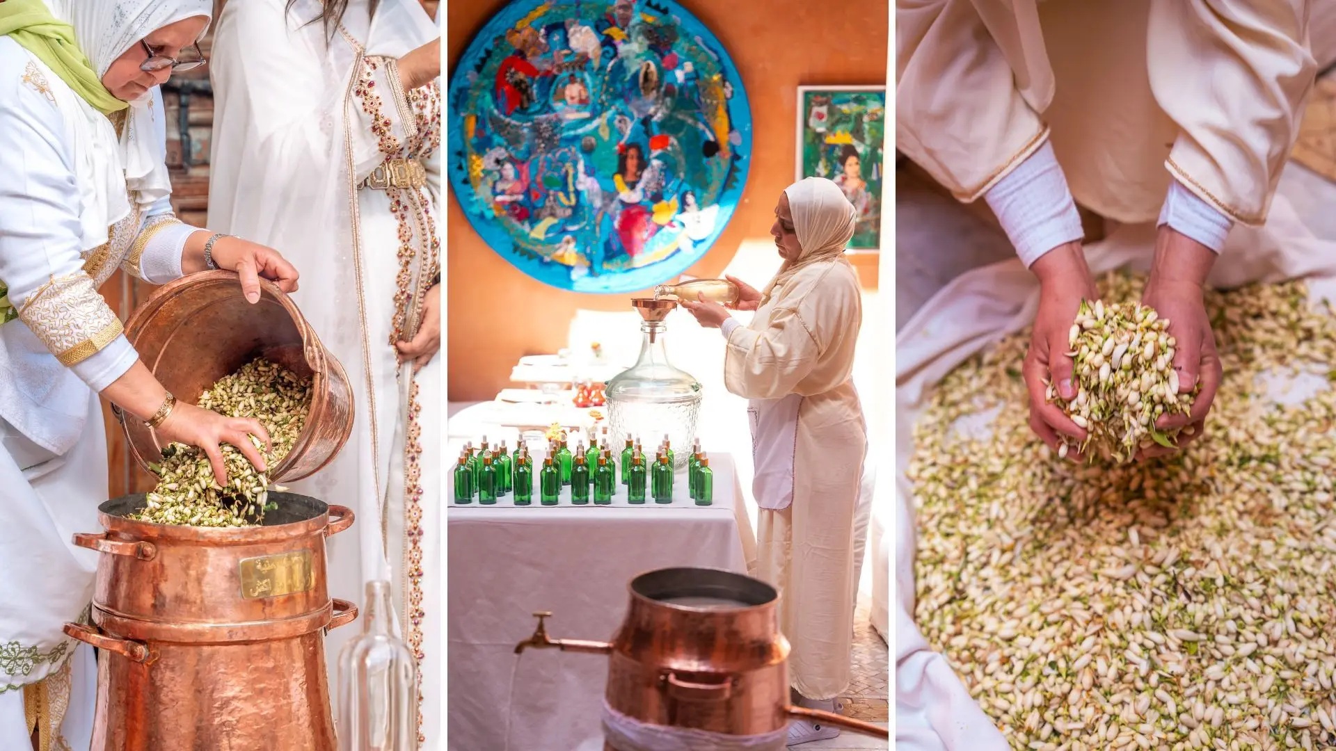 Pour cette édition 2026, les Jardins de la Médina, partenaires fidèles du moussem, ouvrent leurs portes le dimanche 22 mars à partir de midi. Au programme : une démonstration de distillation artisanale conduite par les membres d’Al Muniya, un buffet déjeunatoire aux saveurs marocaines dressé en plein air, un concert de musique andalouse mené par le luthiste Abderrahmane et son orchestre, et des séances de tatouage au henné. L’ancien palais de la Kasbah, avec ses deux hectares de jardins plantés d’oliviers, de citronniers et de bigaradiers, offre un cadre où le cérémonial retrouve quelque chose de son échelle d’origine, à la fois privée et généreuse.